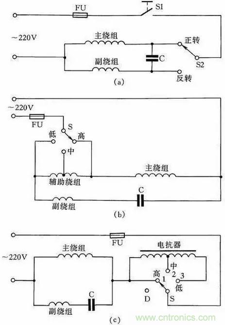 圖16(b)為帶輔助繞組的接線線路,撥動開關(guān)S,可改變輔助繞組的抽頭,即改變主繞組的實際承受電壓,從而改變電動機的轉(zhuǎn)速,此接線方法常用于電風(fēng)扇上。
