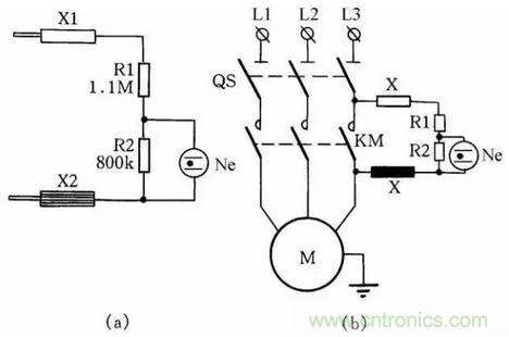 如果絕緣電阻合乎標(biāo)準(zhǔn)(即絕緣電阻值大于0.5MΩ),則泄漏電流很小時,在R2上的電壓降小于氖泡的點燃電壓,Ne不亮;當(dāng)任意兩相或三相同時對機殼的絕緣電阻降低時,泄漏電流大增,使氖泡Ne點燃,從而可判定絕緣不合格。