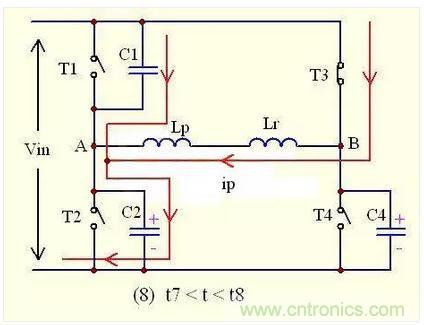 達到t6時刻之后,移相全橋的正半周期工作結束;并開始負半周期工          作,其工作原理與正半周期相似,下面來做進一步的分析: