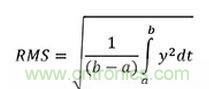 波形的RMS值的數學定義是通過對信號先求平方、再取平均值、然后取平方根得到的值。平均時間窗口必須具有合適的長度,以允許在測量所需的最低頻率下進行濾波。在方程式中,波形隨時間的RMS值為: