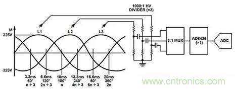 在此應用中,Analog Devices 的 AD8436 RMS轉直流轉換器與3:1多路復用器配合使用,允許單個RMS轉直流轉換器監視三相。使用三個1000:1高壓分壓器對相電壓進行采樣。