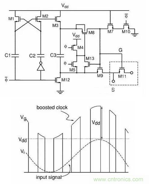 電路用在各種ADC之前的Sample電路,可以讓ADC實現(xiàn)rail to rail的input,sample電路的工作電壓超過Vdd,極大的減少了了setting time,而且?guī)缀鯖]有reliability的問題。電路里沒有任何一個器件是可以被減少或者改變位置的。此電路直接使得ADC的發(fā)展往前躍進了一大步,現(xiàn)在已經(jīng)幾乎成為除ΔΣ之外各種ADC的標配,成為歷史上最經(jīng)典的模擬電路之一。當然,電路原理一眼看去也不是很好理解。