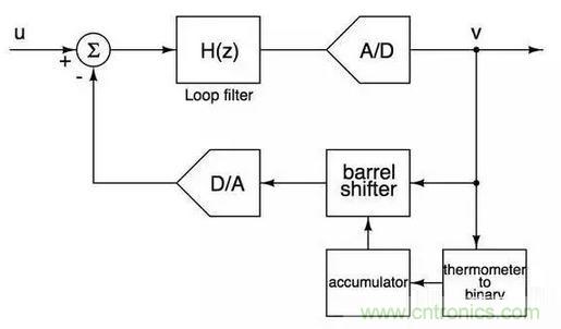 基本思想是快速遍歷DAC中的每一個電流元從而減少電流元mismatch對ADC信噪比的影響,僅僅通過幾個簡單的數(shù)電模塊就實現(xiàn)對電流元mismatch的first order noise shaping,非常巧妙。