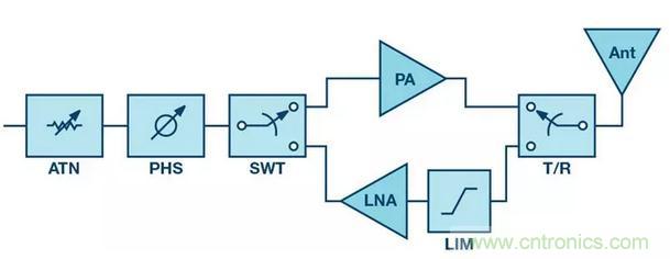 它們包括一個用于調整每個天線元件相位(最終控制天線)的移相器、一個可以使波束逐漸變細的衰減器、一個用于傳輸信號的功率放大器和一個用于接收信號的低噪聲放大器,另有一個用于在發射與接收之間切換的開關。在過去的實施方案中,這些IC中的每一個都可能放在5mm×5mm的封裝中,更先進的解決方案則可能用集成式單片單通道GaAs IC來實現該功能。