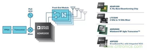 該波束成形IC專為模擬相控陣應用或混合陣列架構而開發,混合陣列架構將一些數字波束成形技術與模擬波束成形技術結合了起來。ADI公司提供從天線到位的完整解決方案,包括數據轉換器、頻率轉換、模擬波束成形IC以及前端模塊。組合芯片組使ADI公司能夠將多種功能組合起來并對IC進行適當優化,從而輕松地為客戶實現天線設計。