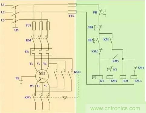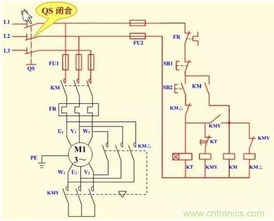 由電源隔離開關QST熔斷器FU1、FU2;交流接觸器KM、KMY、KMs;熱繼電器FR;時間繼電器KT;啟動按鈕SB2;停機按鈕SB1及電動機M組成。
