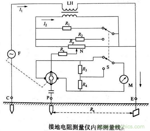 接地電阻測(cè)量?jī)x由手搖發(fā)電機(jī)F、電流互感器LH、倍率開(kāi)關(guān)S、調(diào)節(jié)電位器Rp及檢流計(jì)M等組成,全部機(jī)構(gòu)裝在塑料殼內(nèi),外有皮殼便于攜帶,附件有輔助探棒、導(dǎo)線等,其內(nèi)部測(cè)量線路如下圖所示。