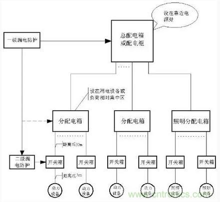1、總配電箱以下可設若干分配電箱,分配電箱以下可設若干開關箱;總配電箱應設在靠近電源的區域,分配電箱應設在用電設備或負荷相對集中的區域,分配電箱與開關箱的距離不得超過30m,開關箱與其控制的固定式用電設備的水平距離不宜超過3m。(JGJ46-2005第8.1.2條)