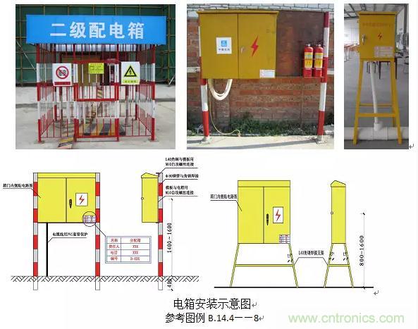 3、配電箱、開關箱應裝設端正、牢固;固定式配電箱、開關箱的中心點與地面的垂直距離應為1.4~1.6m;移動式配電箱、開關箱應裝設在堅固的支架上,其中心點與地面的垂直距離宜為0.8~1.6m。(JGJ46-2005第8.1.8條)