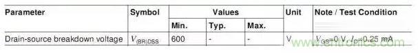 這個(gè)參數(shù)是有條件的,這個(gè)最小值600V是在Tj=25℃的值,也就是只有在Tj=25℃時(shí),MOSFET上電壓不超過(guò)600V才算是工作在安全狀態(tài)。