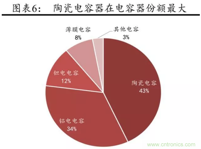 據中國產業信息網 2017年 5 月報道,陶瓷電容器在包括鋁電解電容 器、鉭電解電容器及薄膜電容器在內的四類主要電容器中市場份額最高,達到約43%,是當前生產規模最大、發展最快的片式元器件之一。