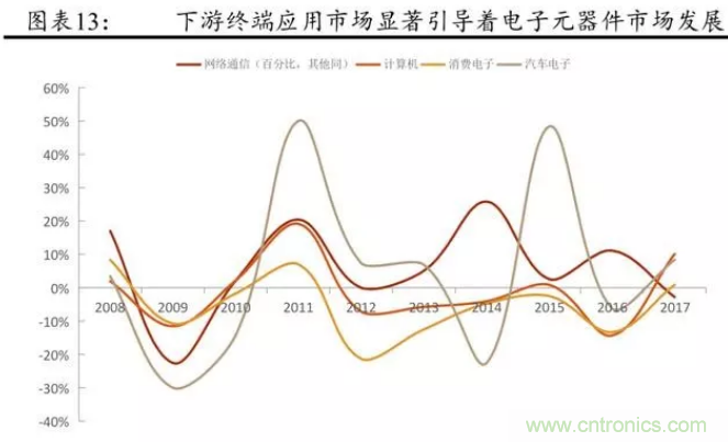 從被動元件的發展歷程來看,近些年來,產業鏈下游的需求擴大主導著被動元件市場的擴張。金融危機以來,全球電子元件市場規模的增長主要來自于網絡通信與汽車電子,尤其是智能手機。