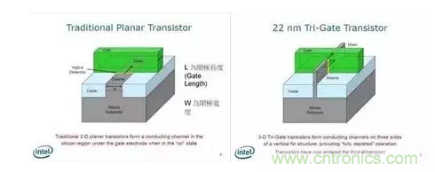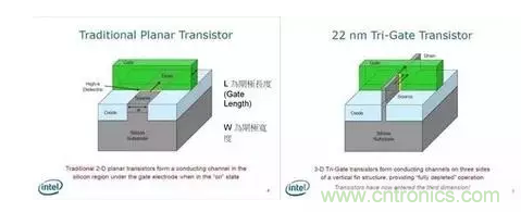 不過,制程并不能無限制的縮小,當我們將電晶體縮小到 20 納米左右時,就會遇到量子物理中的問題,讓電晶體有漏電的現象,抵銷縮小 L 時獲得的效益。作為改善方式,就是導入 FinFET(Tri-Gate)這個概念,如右上圖。在 Intel 以前所做的解釋中,可以知道藉由導入這個技術,能減少因物理現象所導致的漏電現象。