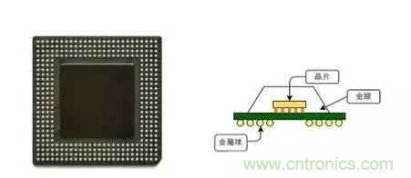 ▲ 左圖為采用 BGA 封裝的芯片。右圖為使用覆晶封裝的 BGA 示意圖。(Source:左圖 Wikipedia)