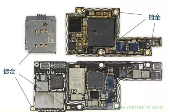 iPhone X的電路板,外露部分全部鍍金。