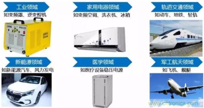 作為新型功率半導體器件的主流器件,IGBT已廣泛應用于工業、 4C(通信、計算機、消費電子、汽車電子)、航空航天、國防軍工等傳統產業領域,以及軌道交通、新能源、智能電網、新能源汽車等戰略性新興產業領域。