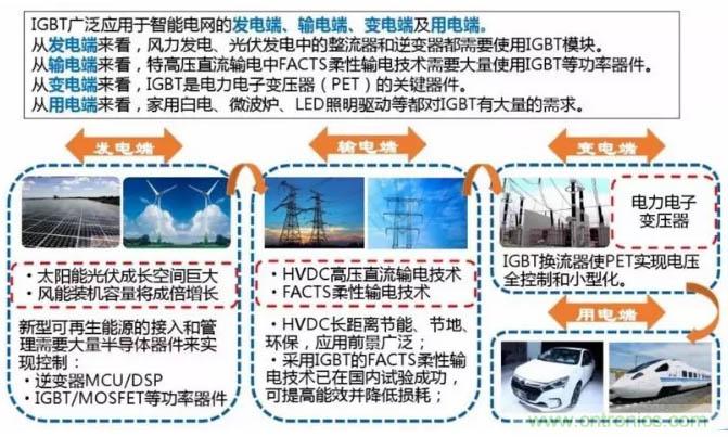 IGBT廣泛應用于智能電網的發電端、輸電端、變電端及用電端: