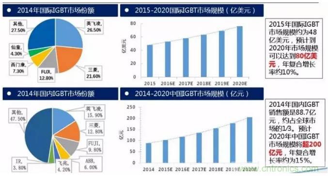 2015年國際IGBT市場規模約為48億美元,預計到2020年市場規??梢赃_到80億美元,年復合增長率約10%。2014年國內IGBT銷售額是88.7億元,約占全球市場的1∕3。預計2020年中國IGBT市場規模將超200億元,年復合增長率約為15%。