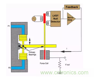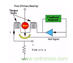 如果對這個組件施加加速度,就會對質(zhì)量施加一個力,它將試圖從零位置移動。當(dāng)零檢測器檢測到運動時,通過伺服放大器增加線圈電流以保持零位置。