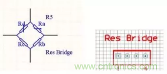 (a)電阻橋的原理圖符號及對應的元器件封裝