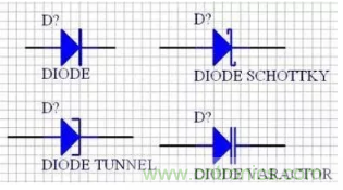 二極管的原理圖符號為“DIODE”,對應的二極管的封裝為封裝屬性系列,如“DIODE-0.4”(小功率)到“DIODE-0.7”(大功率),其中0.4和0.7指二極管的焊盤間距,一般用“DIODE0.4”。值得一提的是,普通的發光二極管的元器件封裝為“RB.1/.2”。