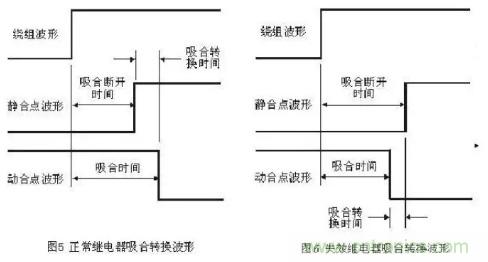 轉(zhuǎn)換時(shí)間包括吸合轉(zhuǎn)換時(shí)間和釋放轉(zhuǎn)換時(shí)間。以吸合轉(zhuǎn)換時(shí)間為例,繼電器在吸合過程中,靜合點(diǎn)斷開時(shí)間與動(dòng)合點(diǎn)吸合時(shí)間之差稱為吸合轉(zhuǎn)換時(shí)間。圖5和圖6分別顯示了合格繼電器和失效繼電器的吸合轉(zhuǎn)換波形。