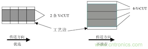 拼板方向應平行傳送邊方向設計, 當尺寸不能滿足上述拼版尺寸要求的例外。一般要求“V-CUT”或郵票孔線數量≤3(對于細長的單板可以例外),見圖3.4。