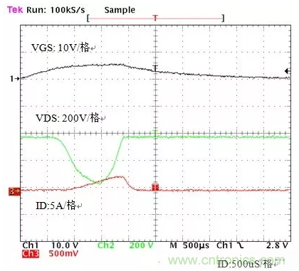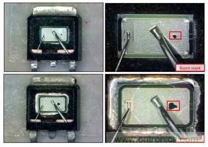 例2:日光燈電子鎮流器的PFC電路,系統在動態老化測試過程中,MOSFET產生損壞失效,測試實際的電路,在起動過程中,MOSFET實際驅動電壓只有5V左右,MOSFET相當于有很長的一段時間工作在線性區,器件形成局部熱點,而且離G極比較近,因此,器件是在開通過程中,由于較長時間工作線性區產生的失效,工作波形和失效形態如圖2、圖3所示。