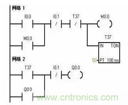 1.延時啟動控制 設計延時啟動程序,要利用中間繼電器(內部存儲器M)的自鎖狀態使定時器能連續計時。定時時間到,其常開觸點動作,使Q0.0動作。