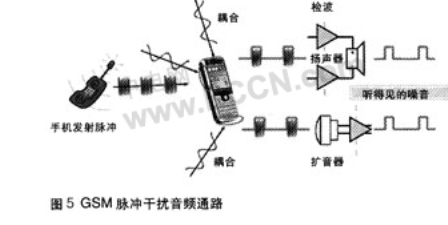 當手機與基站通訊,或兩個手機彼此接近時,發射脈沖通過擴音器,揚聲器,或頭戴式耳機線傳人音頻通路。見圖5。