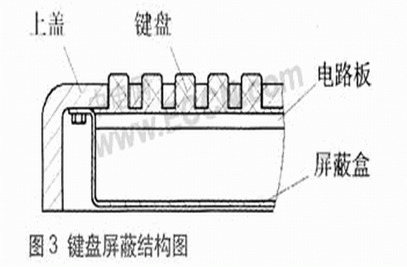 本終端鍵盤采用硅橡膠專用鍵盤,安裝在上蓋表面,開口較多,易引起電磁泄漏,降低屏蔽效能。因為孔縫對電磁波的衰減與干擾波波長及孔縫尺寸有關,一般應使孔洞的尺寸遠小于電磁波的波長,只要孔縫的直徑足夠小,就能夠達到所要求的屏蔽效能。但一般按鍵的大小、排列應符合人們的操作習慣,按鍵太小使用不方便,故這里主要采取安裝屏蔽罩的方法來減少電磁泄漏。鍵盤的屏蔽結構設計如圖3所示。