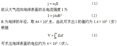很多人都不清楚,地球也是一個(gè)帶電體。根據(jù)實(shí)驗(yàn)測(cè)試,在地球表面存在一個(gè)垂直向下的穩(wěn)定電場(chǎng),電場(chǎng)強(qiáng)度E約為100伏/米,場(chǎng)強(qiáng)的大小隨高度的增加而減弱。另外,根據(jù)實(shí)驗(yàn)測(cè)試,在地面附近大氣的電導(dǎo)率σ0約為3×10-14西蒙/米,且隨高度的增加而增加。由此可知地球表面的電流密度j的方向指向地心,大小為: