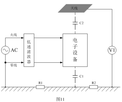 輻射干擾一般是通過電磁感應的形式在空間進行傳播的,圖11是測試電子設備產生輻射干擾的基本方法,或表示電子設備產生的干擾信號通過電磁感應向空中輻射的原理。圖11中,電子設備表示干擾信號源,V1表示測量儀表,C1表示電子設備對大地的電容,C2表示電子設備與天線偶合的電容,即:電子設備通過電場對天線產生感應,這里的天線也可以看成是被干擾的設備。圖11的測試方法就是測試電子設備周圍規定距離某處的電磁場強度,由于干擾信號一般都是一個頻率成份非常豐富的非正弦波,因此,無法對它進行直接測量,只能對它其中某一個頻率信號單獨進行測量。