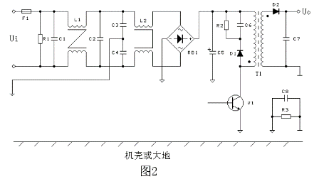 圖1 是一個普遍應用的反激式(或稱為回掃式)開關電源工作原理圖,50Hz 或60Hz 交流電網電壓首先經整流堆整流,并向儲能濾波電容器C5 充電,然后向變壓器T1與開關管V1組成的負載回路供電。圖2 是進行過電磁兼容設計后的電原理圖。