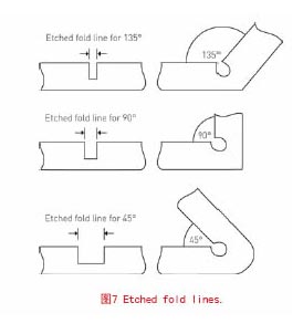 PCM有一些優點,加工和工具修改花費較低,整個過程所需要的時間較短。彎線可以被很精確的蝕刻出來,例如,135,90或者45度,如圖7。整個過程沒有毛邊和金屬應力,磁和其他金屬特性不變??梢院芊奖愕挠糜趶碗s的設計,產品有縫,軌道限界孔,徽標和其他細節不會增加最后的費用,這可以使設計者隨意設計他們想要的東西。