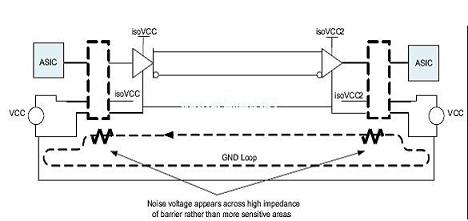 如圖4所示,通過相對于其他電路組件而言的高阻抗,隔離中斷了由電路通路形成的環路。通過中斷該環路,噪聲電壓出現在隔離層上,而非出現在接收機或更為敏感的組件上。噪聲電壓的高電平可以由外部電流或電壓源(例如:電感馬達和閃電(lightning))耦合。[page]