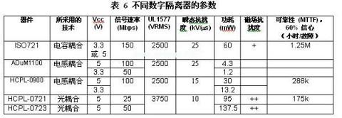 噪聲降低和噪聲保護使得隔離器在那些隔離器中斷接地環路并將接地電壓差隔離的電子電路中得到廣泛使用。設計人員現在擁有許多用來進行數字信號隔離的選擇,包括TI推出的ISO72x系列,其在信號速率、電介質擊穿電壓、瞬態抗擾度、功耗、磁場抗擾度以及可靠性等重要特性方面均表現不俗。表6對本報告中所討論實例的這些特性進行了總結。