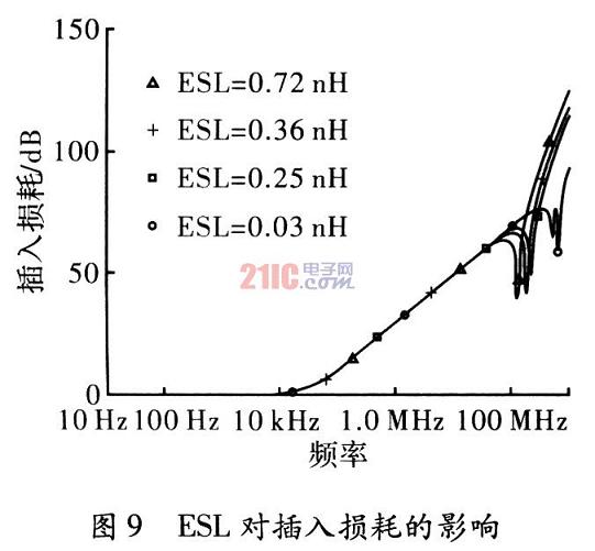 考察三端電容器與信號線串聯的等效串聯電感ESL對插入損耗的影響。取共模電容Cy為3 300 pF,取ESL分別為0.03 nH,0.36 nH和0.72 nH,其他參數值不變。從圖9的仿真結果可以看出,隨著ESL降低,諧振點提高,諧振點之后的插入損耗下降。