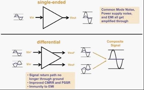 如圖2所示,單端信號會對共模噪聲、電源噪聲和電磁干擾比較敏感,運放會對這些噪聲一定程度的放大。而差分信號由于兩側信號自身形成電流回路,抑制了共模噪聲和干擾,僅對差模信號進行有效放大。