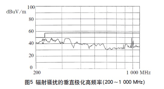 本開(kāi)關(guān)電源一次通過(guò)了傳導(dǎo)騷擾的測(cè)試,測(cè)試波形如圖2、3所示。輻射騷擾高頻段230~1000MHz也測(cè)試合格,如圖5所示。只是在30~200MHz頻段范圍內(nèi)的垂直極化指標(biāo)超標(biāo),最大超標(biāo)20dB,如圖4所示。