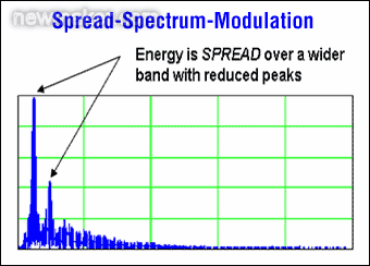 圖3:擴(kuò)頻后的開關(guān)頻率及其諧波分布特性