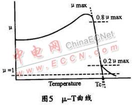 選擇電感的磁芯材料不但要考慮其磁特性,還要考慮其溫度特性,包括高低溫下的磁性變化和磁性材料的居里溫度特性。磁芯由鐵磁性(亞鐵磁性或反鐵磁性)轉(zhuǎn)變成順磁性的溫度稱為居里溫度。在圖5所示的 μ-T曲線上,80%μmax與20%μmax連線與μ=1的交叉點(diǎn)相對(duì)應(yīng)的溫度,即為居里溫度Tc。
