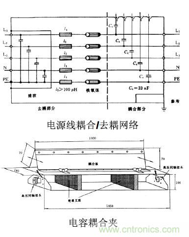 作為佐證,我們利用電源線耦合/去耦網(wǎng)絡(luò)來加以說明:在圖中可以看到從試驗(yàn)發(fā)生器來的信號電纜芯線通過可供選擇的耦合電容加到相應(yīng)的電源線(L1、L2、L3、N及PE)上,信號電纜的屏蔽層則和耦合/去耦網(wǎng)絡(luò)的機(jī)殼相連,機(jī)殼則接到參考接地端子上。這就表明脈沖群干擾實(shí)際上是加在電源線與參考地之間,因此加在電源線上的干擾是共模干擾。