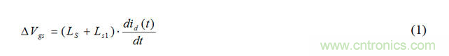 在諧振條件(ωL = 1/ωC)下,柵極和源極 電壓中生成的震蕩電壓遠大于驅動電壓。因諧振變化而產生的電壓振蕩與品質因數成正比, Q(=ωL/R = 1/ωCR)。當MOSFET關閉時,漏極寄生電感(LD + Ld1)、柵極-漏極電容Cgd和柵極引線電感Lg1網絡造成柵極 振蕩電壓。如果柵極電阻 (RG-ext.+Rg_int.)極小,則Q變大。另外,LS兩端的壓降和Ls1源極雜散電感在柵極-源極電壓中產生振蕩,可用表達式(1)表示。寄生振蕩可能造成柵源極擊穿、不良EMI、較大開關損耗、柵極控制失效,甚至可能造成MOSFET故障。
