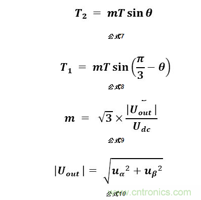 由此可知SVPWM實現步驟:先通過Uout判斷出電壓矢量所在扇區,再根據相鄰的電壓矢量及Uout計算出兩個基本矢量作用時間;最后根據兩個基本矢量作用時間計算出PWM開關時間及占空比。