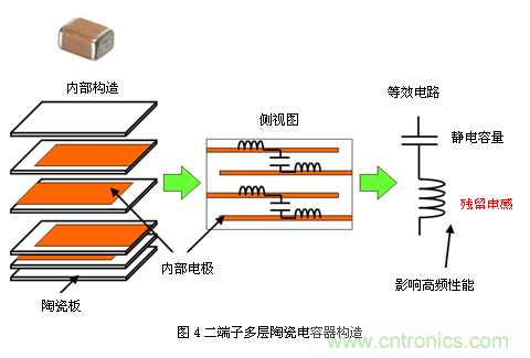 目前所使用的電容器多為片狀多層陶瓷電容器。圖4為二端子片狀多層電容器的結構概念 圖。其結構表現(xiàn)為,夾著電介質(zhì)薄片,分別與兩側外部電極連接的內(nèi)部電極交錯層疊。由于其為片狀結構,且無引線,因此該部分沒有殘留電感。然而,由于其內(nèi)部 還存在微量電感,因此在較高頻率下將導致性能下降。