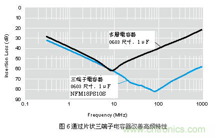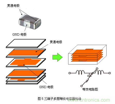 如圖5所示,片狀三端子電容器雖名為三端,但實為四端結構。這是因為,雖然四端設計可減少接地端電感,但電氣特性方面,無論哪個端子都具備相同電位。而引線型三端子電容器原本就為三端結構,因此貼片化后仍被稱為"三端"。[page]