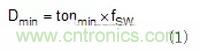 試圖在2MHz條件下工作時的第二個考慮因素是最小輸入電壓(VIN)和輸出電壓(VOUT)的轉(zhuǎn)換比。這與轉(zhuǎn)換器的最小接通時間有關(guān),因為該比率在轉(zhuǎn)換器需要操作時設(shè)定接通時間。例如,若轉(zhuǎn)換器具有100ns的最小導(dǎo)通時間且在2MHz條件下工作,則使用公式1,其可以支持的最小轉(zhuǎn)換比(Dmin)為20%。若給定的VIN至VOUT比所需的導(dǎo)通時間小于最小導(dǎo)通時間,則多數(shù)轉(zhuǎn)換器進入脈沖跨越模式以保持輸出電壓穩(wěn)定。當(dāng)脈沖跨越時,開關(guān)頻率發(fā)生變化且可能在需要限制噪聲的頻率中引起噪聲。