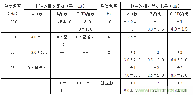 為了鑒別騷擾測量儀是否達到了表2規定的四大類指標,標準又進一步規定了騷擾測量儀的絕對脈沖特性和相對脈沖特性。所謂絕對脈沖特性指輸人規定的周期脈沖信號時騷擾測量儀的讀數應達到規定的值。絕對脈沖特性見表3。