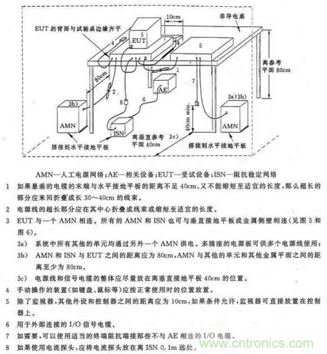 僅是EUT發射的,不會有電網的騷擾混入。另一作用是為測量提供一個穩定的阻抗,因為電網的阻抗是不確定的,阻抗不一樣EUT的騷擾電壓值也不相同,所以要規定一個統一的阻抗,通常為50Ω。AMN實際上是個雙向低通濾波器,電網中的騷擾由50μH和1.0μF的濾波器濾掉,不能進人騷擾測量儀,而EUT發射的騷擾由于50μH濾波器的阻擋不能進人電網,只能通過0.1μF電容進入騷擾測量儀。測量儀的輸入阻抗是50Ω,所以EUT騷擾的負載阻抗約等于50Ω。對于50Hz的工頻電源,仍然可以通過AMN向EUT供電。圖15中的AMN僅是一種基本結構,由基本結構可以組成V型AMN,用于測量電源中相線—地線和零線—地線的不對稱騷擾電壓,見圖16。也可組成Δ型AMN,除了測量線-地間的不對稱騷擾電壓外還可以測量相線—零線間的對稱騷擾電壓,見圖17。測量時EUT和AMN的布置、連接線的長度和走向等都應按標準規定的要求進行。AMN外殼要良好接地,否則將影響電網和EUT之間的隔離。圖18為臺式設備的傳導騷擾測量布置圖。
